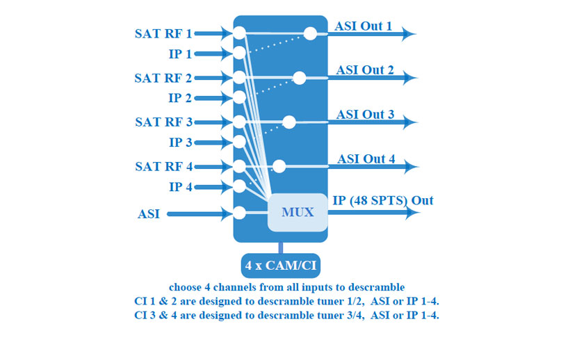 RI-8181 B IRD is RVG’s new design which integrates demodulation (DVB-C, S/S2 optional), de-scrambler and multiplexing in one case to convert RF signals into TS output. It is a 1-U case which supports 4 tuner inputs, 1 ASI and IP. The 4 CAMs/CIs accompanied can descramble the programs input from encrypted RF, ASI and IP. The CAM requires NO unsightly external power cords, cables, or additional remote control device. To meet customers’ various requirements, RI-8181 B is also designed to re-mux programs from any input, and output TS over 48 SPTS UDP.